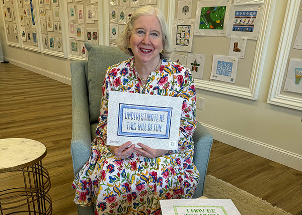 Hand-painted on 18 mesh Zweigart mono canvas, the design measures approximately 5.5" wide by 4" tall.
